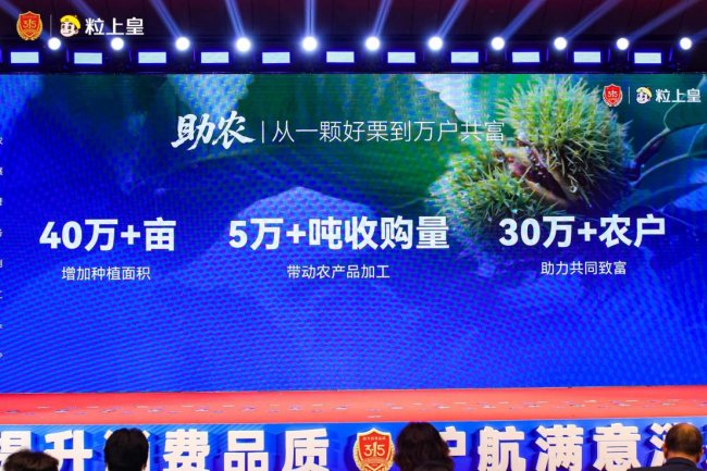 品质是品牌的立身之本,信赖是前行的不竭动力。在3·15论坛主论坛上,粒上皇董事长潘俊海谈及品质坚守,他表示,粒上皇坚持“千里寻栗”,锁定5大核心产区,从源头锁住原料新鲜;并强调了深耕助农事业,实现“从一颗好栗到万户共富”的美好愿景,助力乡村振兴。