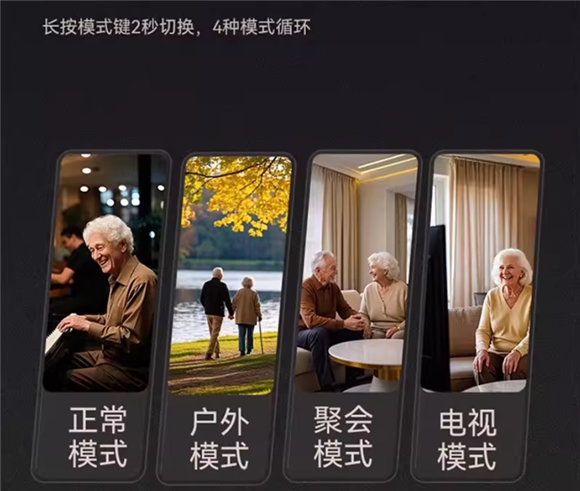 脖挂式采用挂颈设计,防丢便捷、操作简单、续航持久,无需入耳,佩戴无压迫感,适配轻、中度听损以及手部灵活度下降的老人,适合日常遛弯、家庭聚会等休闲场景,不足是体积略大于耳背式,对外观隐蔽性有要求的用户需谨慎选择。