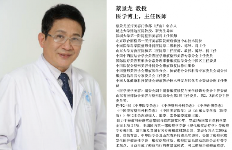 蔡景龙,1965年生,现任济南高新开发区蔡景龙医疗美容门诊部负责人、北京蔡景龙医学研究工作室有限公司法人。1986年毕业于山东大学(原山东医科大学),自此开启整形外科与瘢痕防治生涯。从齐鲁医院普通外科起步,到牵头创建齐鲁医院、山大二院美容整形烧伤外科,他先后破格晋升副教授、教授,担任山东大学硕博研究生导师,获评山东省医药卫生中青年重点科技人才、省整形外科重点学科带头人。2009年加盟中国医学科学院整形外科医院,任整形十六科、瘢痕综合治疗中心主任,获评二级教授、北京协和医学院博导。此后历任三级皮肤病专科医院院长、深圳大学第一附院主任医师、北京联合丽格瘢痕修复中心技术院长,同时兼任延边大学教授、研究生导师,跨越南北、深耕一线,始终扎根瘢痕诊疗最前沿。
