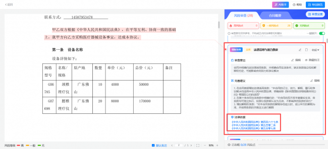 ✅ 智能标注,省去反复核对:高/中/低风险点分类标注并高亮显示,点击就能查看风险说明、法律依据和修改建议,不用再反复翻阅法条、查询实务案例,新人法务也能快速上手,资深法务不用再反复复核新人成果。